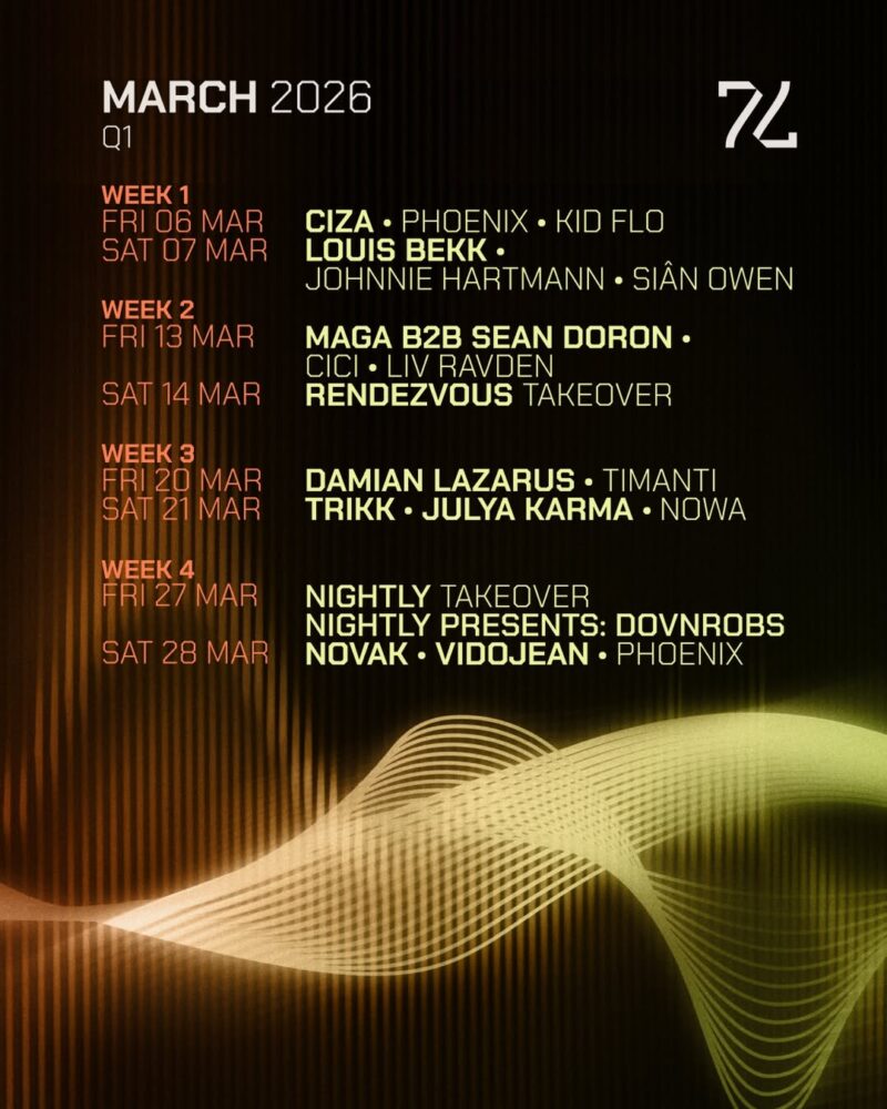The new season opens on Friday, March 6th, with CIZA, Phoenix, and Kidflo, followed by Louis Bekk alongside Sian Owens and Johnnie Hartmann. The following weeks include Maga b2b Sean Doron with Cici and Liv Ravden, while Damian Lazarus returns on Friday, March 20th, joined by Timanti. Trikk and Julya Karma take over on Saturday, March 21st, with support from Nowa, before Novak, VidoJean, and Phoenix close out the month.