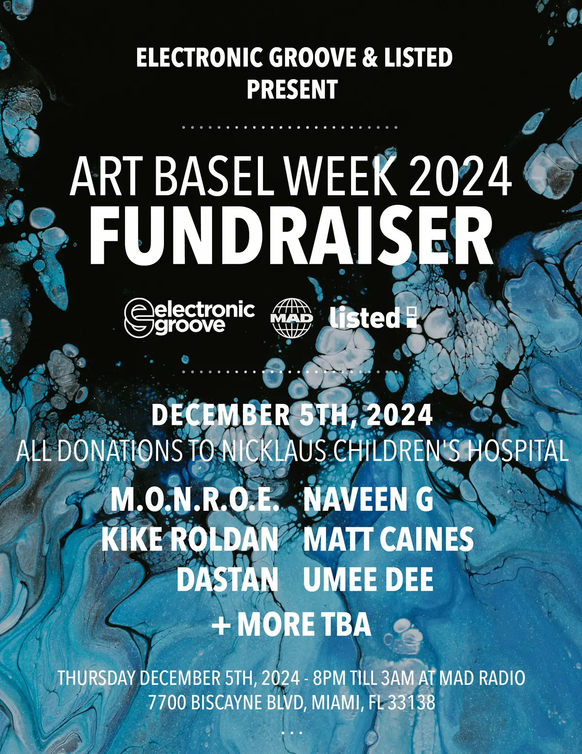 Hosted by Electronic Groove in collaboration with Listed, and the special support of Parties 4 Peace, this charitable night aims to support Nicklaus Children’s Hospital, a leading pediatric institution dedicated to exceptional healthcare for children. All proceeds from the event will be donated, reflecting a heartfelt commitment to giving back to the community.