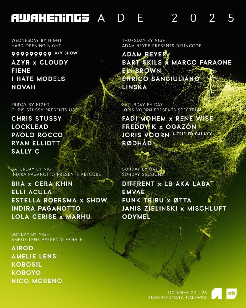 Friday sees USS arrive in Amsterdam for the first time, with Chris Stussy joined by Ryan Elliott, Sally C, Locklead, and Paolo Rocco. Saturday splits into two shows: daytime’s ‘Spectrum’ curated by Joris Voorn, featuring vinyl sets from Freddy K and Ogazón, and hypnotic techno from Rødhåd and Rene Wise, before Voorn closes with his ‘Trip To Galaxy’ concept. At night, Indira Paganotto debuts ARTCORE under Awakenings, joined by Elli Acula, Lola Cerise, Marhu, and Estella Boersma × SHDW.