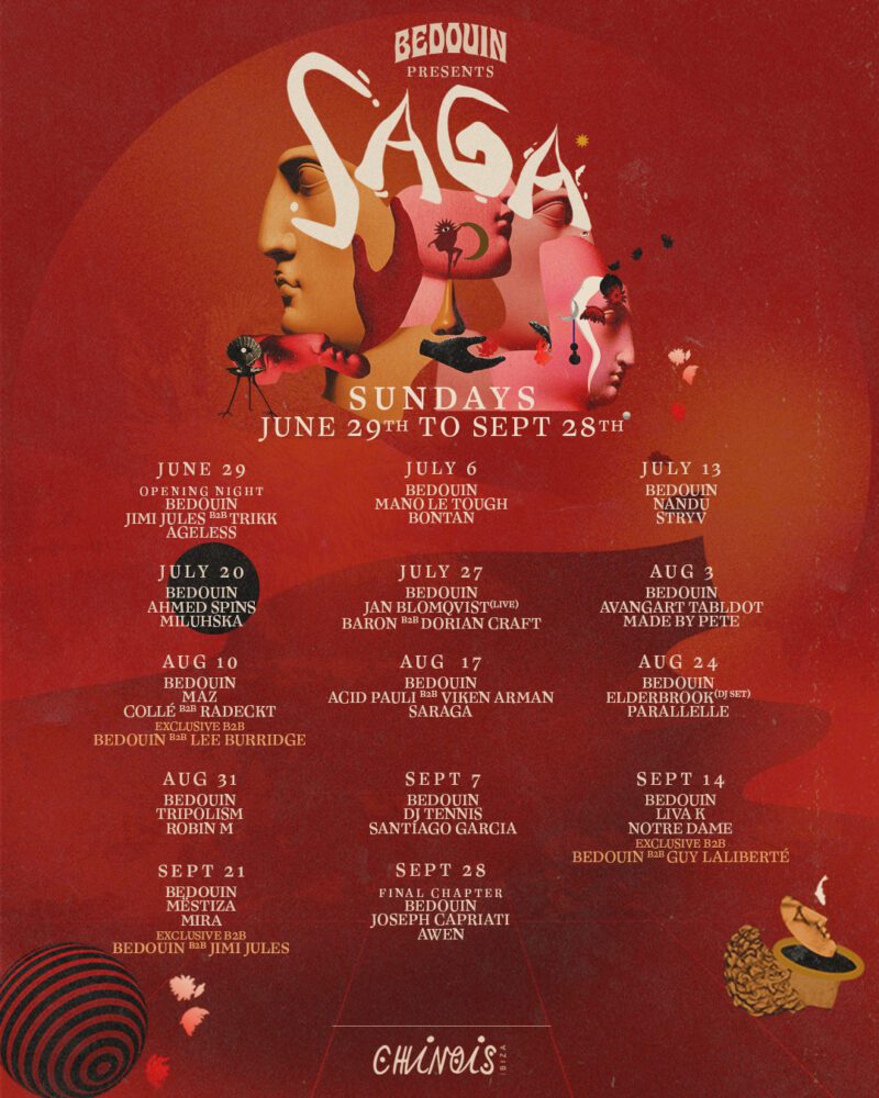 Active on the island since 2017, SAGA combines deep, melodic house with worldly textures, enhanced by cinematic visuals and a dancefloor-first production approach that reflects Chinois’ focus on diversity, connection, and community. Away from Ibiza, the show has visited cities such as Istanbul, Marrakech, London, New York, and Los Angeles, while Bedouin themselves have appeared at events including Coachella, Tomorrowland, and Burning Man.