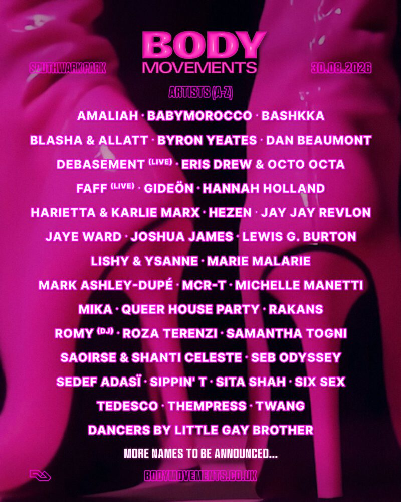 As part of its ongoing collective-led model, Body Movements will once again host takeovers and co-curations from crews including 2CPERREA, Adonis, Bodyswap, Boudica, Club Are, Dalston Superstore, Daytimers, Fèmmme Fraîche, House of Revlon UK, Inferno, Jungle Kitty, Little Gay Brother, Meat Free, Neurotica, PLASTYK, Playbody, Queer House Party, Rawmantique, and Sextou.