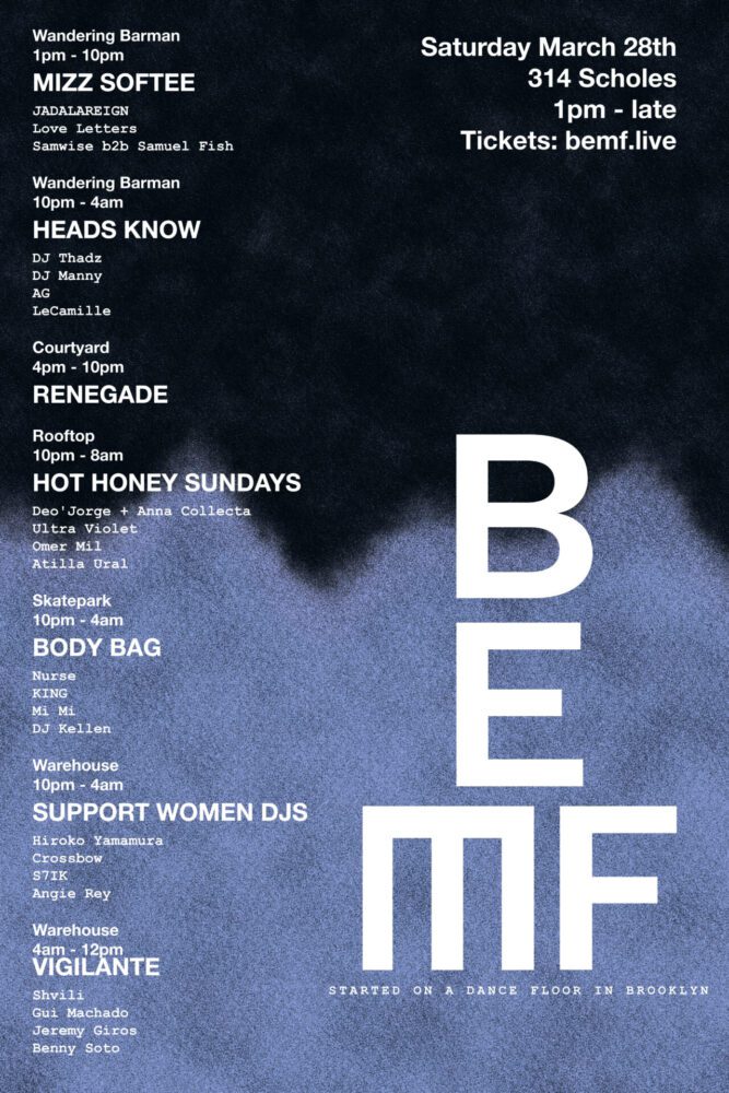 Built on the foundations of Brooklyn’s underground culture, BEMF continues to prioritize community-driven programming and direct artist connection. The 2026 edition features seven curated lineups, spanning warehouse, skatepark, rooftop, courtyard, and bar settings, alongside panels, food vendors, and live performances throughout the day and night.