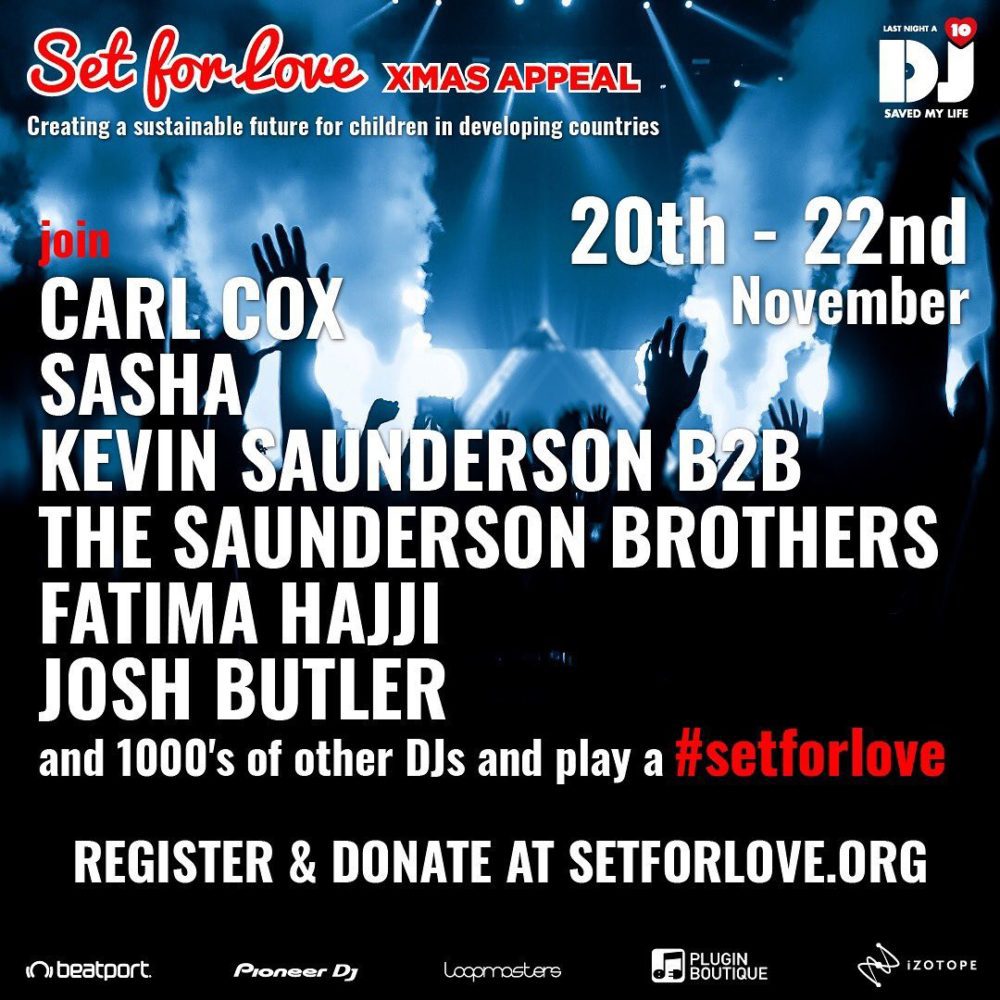 This Friday is the beginning of the Set For Love Xmas Appeal fundraiser, which seeks to develop a sustainable future for children in developing countries. Lending a helping hand to the cause, a group of artists led by Sasha, Carl Cox, Fatima Hajji, Kevin Saunderson B2B The Saunderson Brothers, and Josh Butler will be headlining the event, which will be put organized by the charity Last Night A DJ Saved My Life.