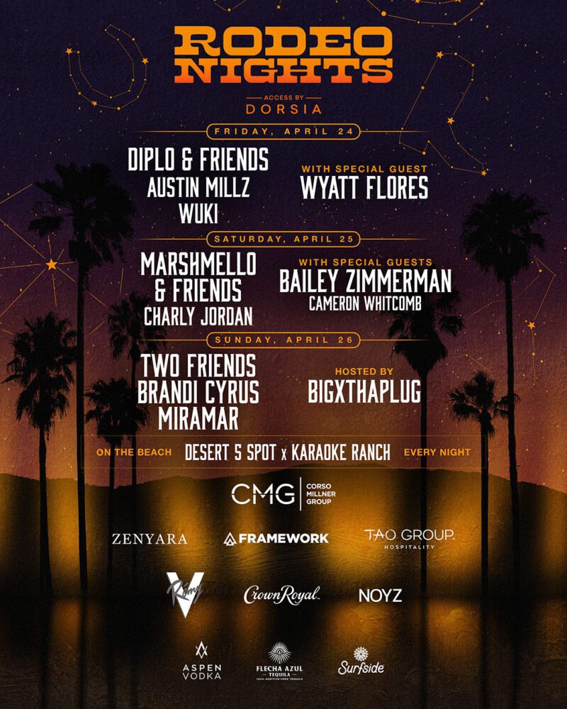 Corso Millner Group and Framework have announced the lineup for Rodeo Nights 2026, scheduled for April 24th through April 26th at the Zenyara estate. The three-night event features headlining performances from Diplo and Marshmello, marking their return to the series following the 2025 edition.
