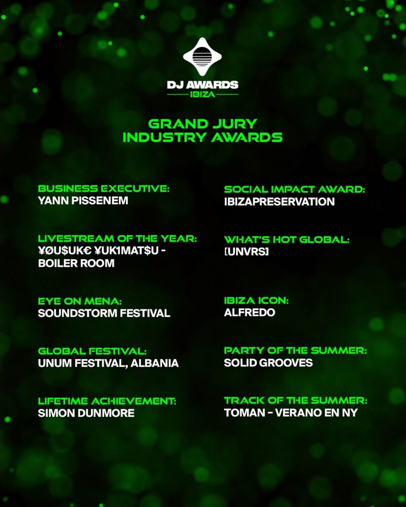 Additional honors came via the Grand Jury Industry Awards, including Simon Dunmore (Lifetime Achievement), Solid Grooves (Ibiza Party of the Summer), Soundstorm (Spotlight: MENA), and Toman’s ‘Verano En NY’ (Ibiza Track of the Summer). The Ibiza Icon Award was posthumously given to Alfredo, paying tribute to the late Balearic pioneer.