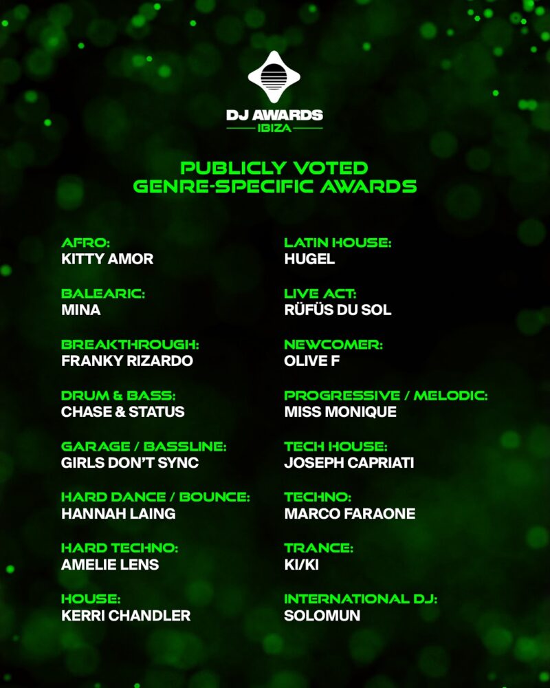 Winners were selected across genre-specific categories, with standout names including Solomun (International DJ), Amelie Lens (Hard Techno), Miss Monique (Progressive/Melodic House), and RÜFÜS DU SOL (Live Act). The awards also highlighted new additions, such as Balearic, won by MINA, and Hard Dance/Bounce, awarded to Hannah Laing.