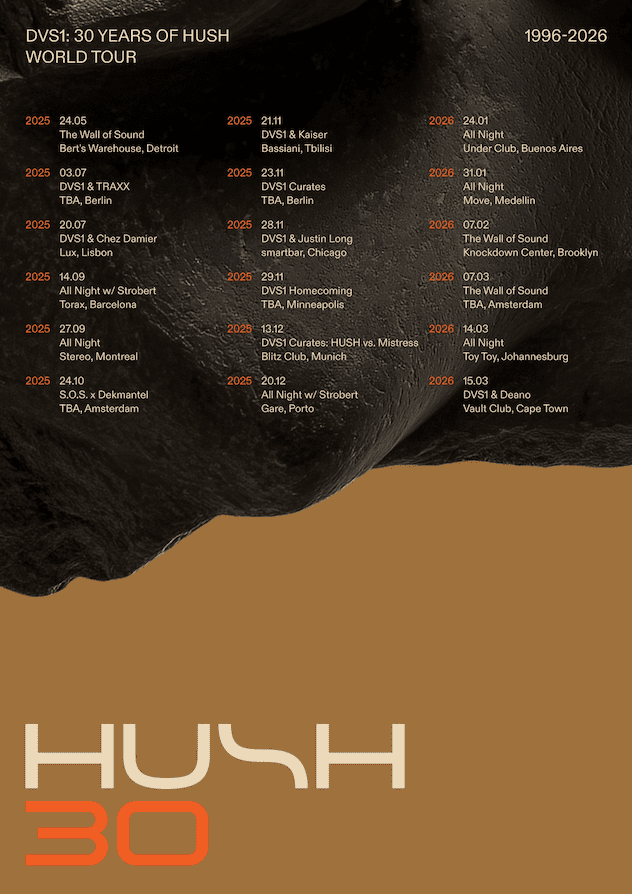 DVS1 has unveiled plans for a global tour marking the 30th anniversary of his influential platform, HUSH. The tour launches this weekend in Detroit during Movement and will span cities including Berlin, Montreál, Amsterdam, Tbilisi, Chicago, Brooklyn, Johannesburg, and Buenos Aires.