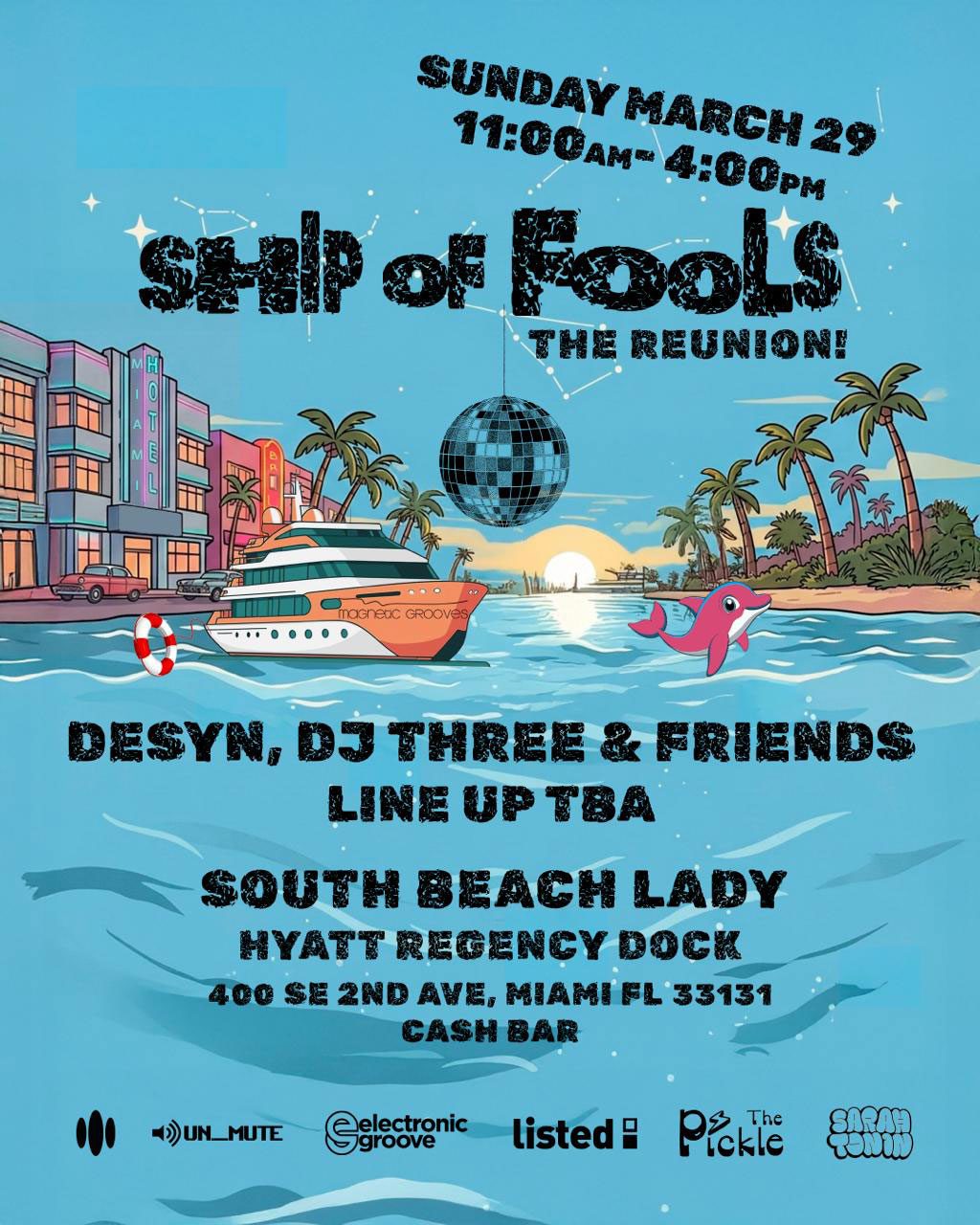 Boarding in the early hours of Sunday, March 29, this special Ship of Fools Reunion will once again set sail aboard the iconic South Beach Lady, departing promptly at 11AM and returning to shore at 4PM — properly fooled.
