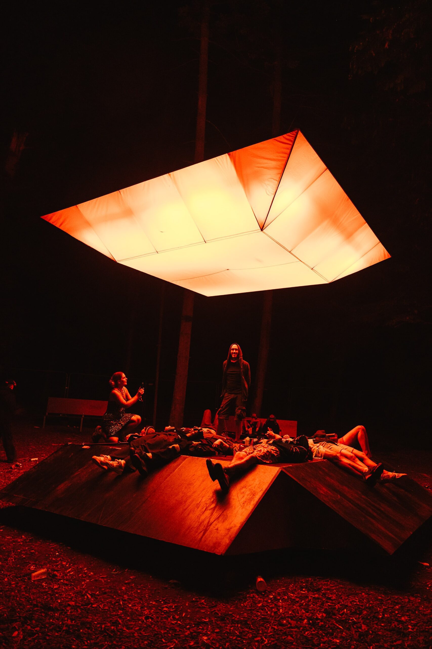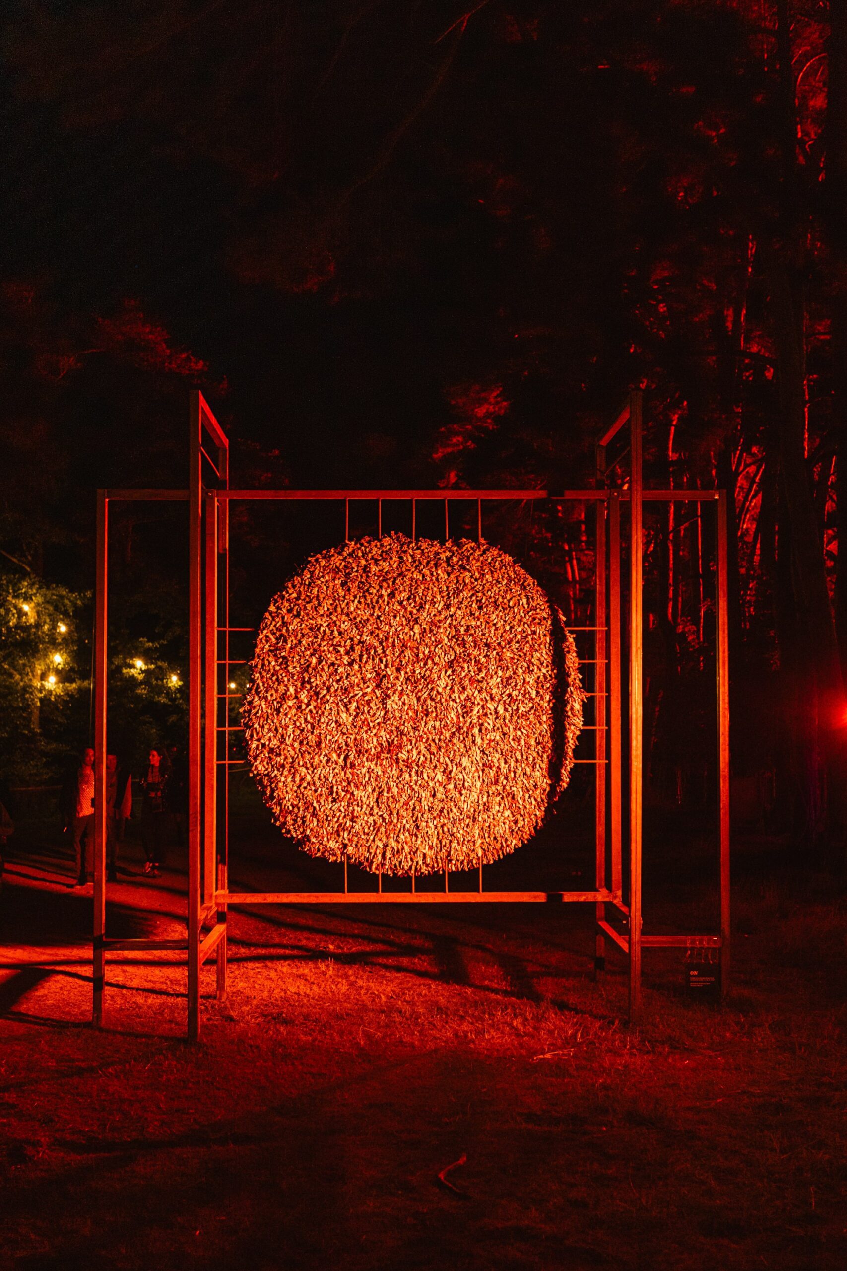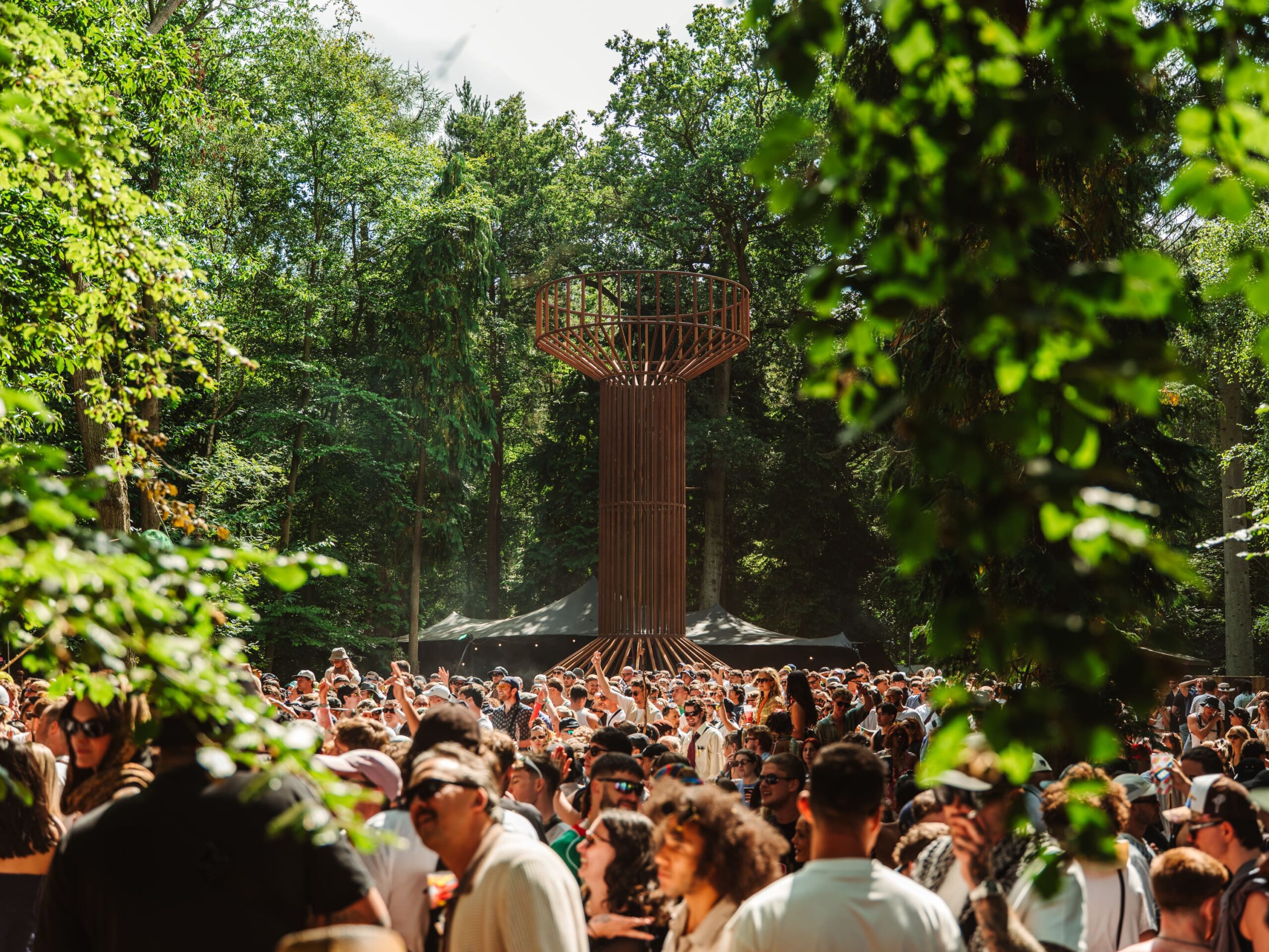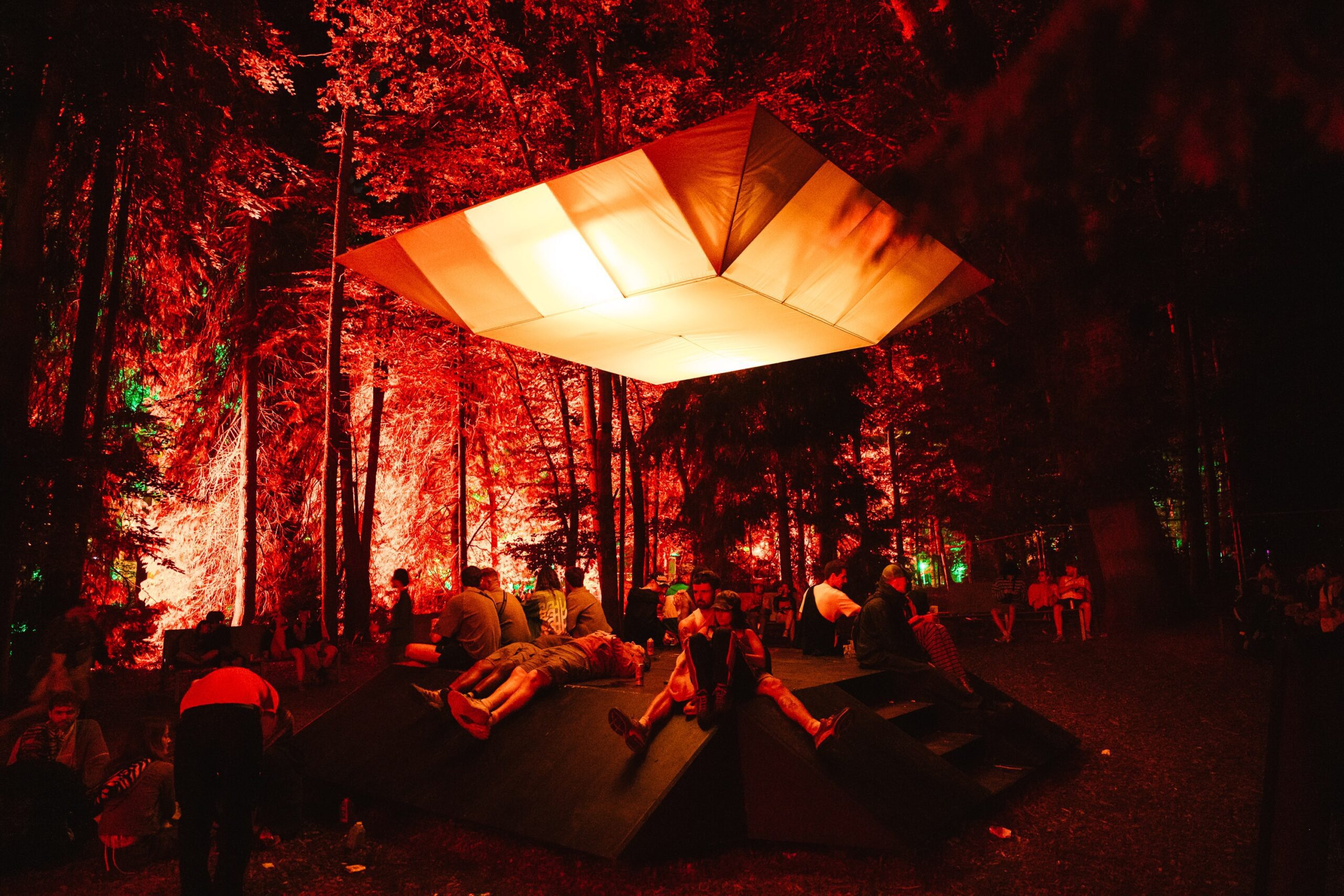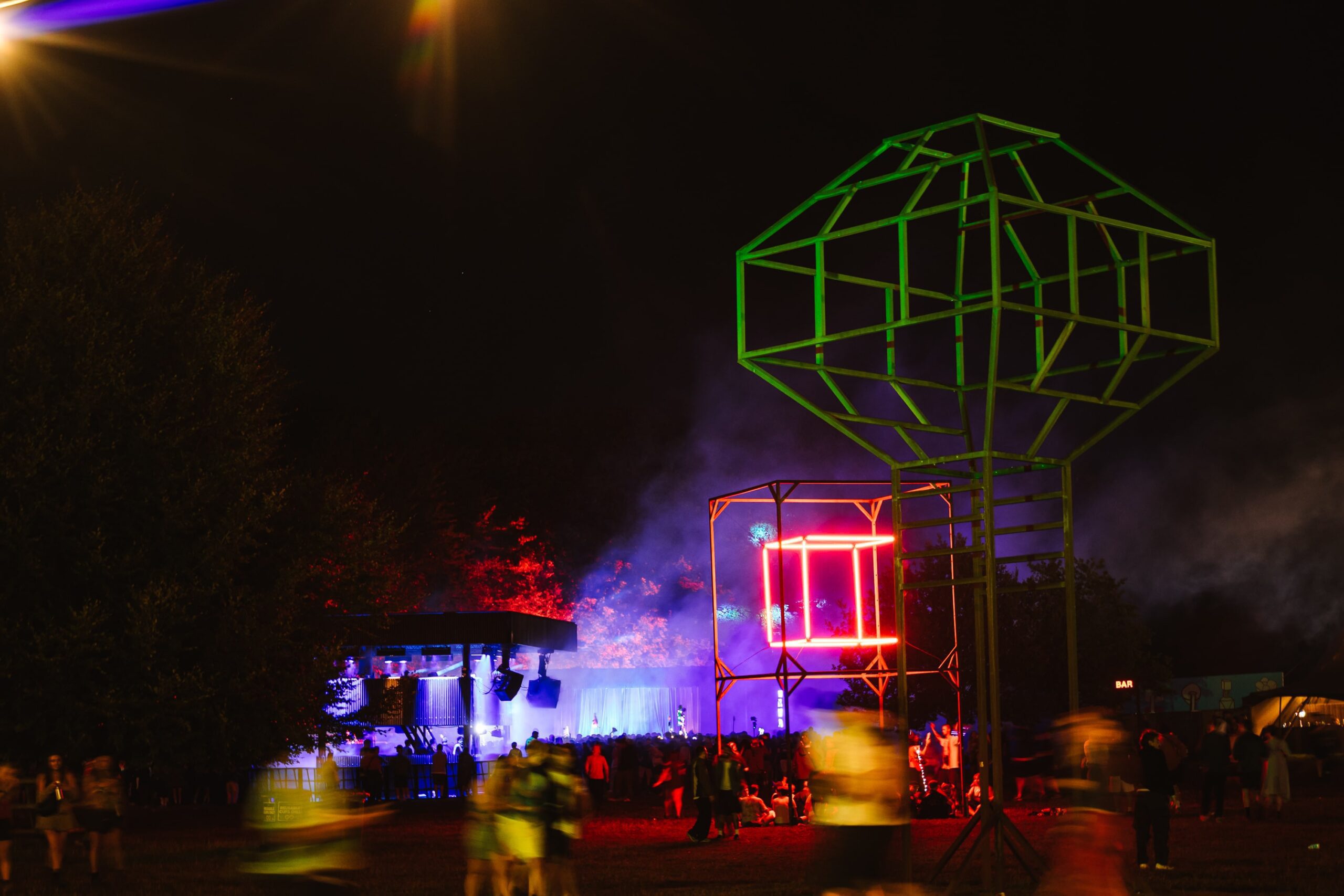 On the walk from the field back into the forest, I took a moment to really soak in the beauty of Houghton’s grounds. Few festivals can match them — sprawling lawns framed by towering trees, pockets of hidden stages, and incredible art installations scattered throughout. One standout was Pulse, an art commission from EBBA Studio led by Benni Allan, which created a serene space where festival-goers could pause, breathe, and watch the piece echo the rhythms of the forest around it.