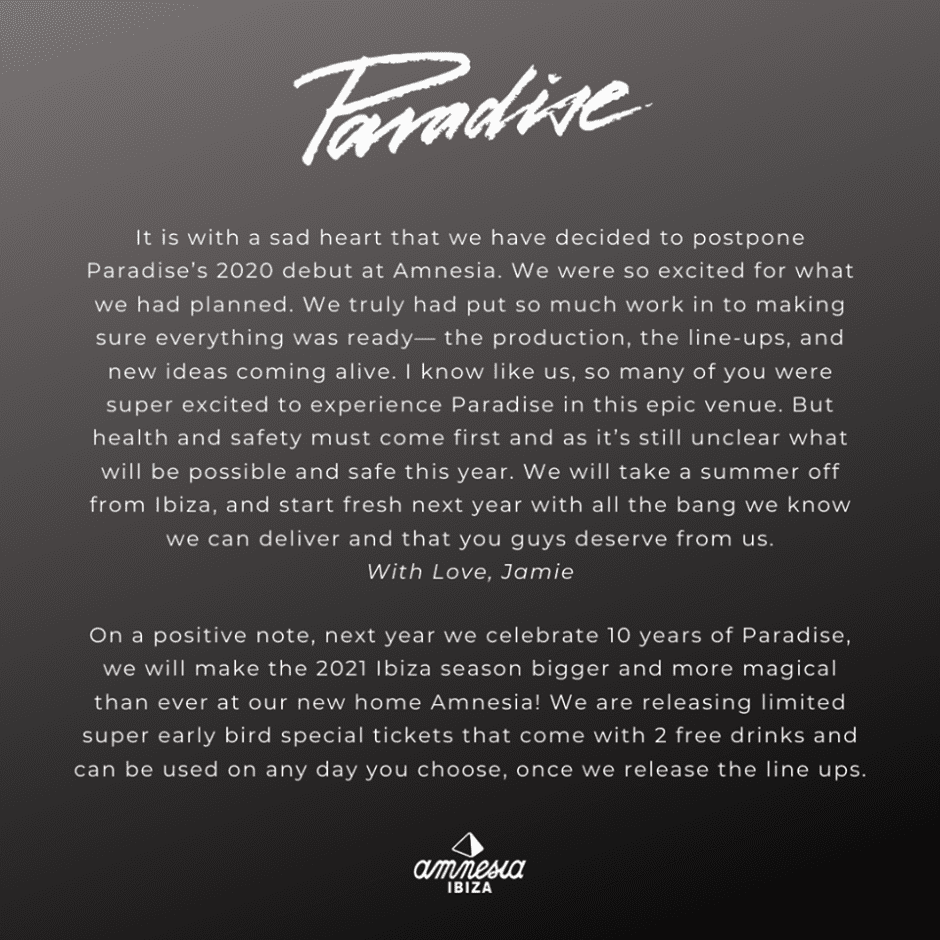 Jamie Jones and his Paradise Ibiza parties have announced today that they will postpone their first season at Amnesia until the summer of 2021.