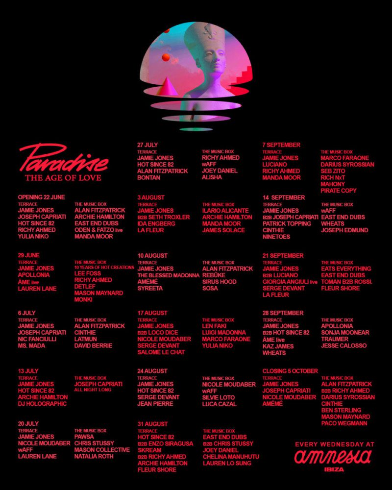 For 16 Wednesdays, Paradise expands its universe from June 22nd until October 5th, with standout guests including Âme (Live), Archie Hamilton, The Blessed Madonna, DJ Holographic, Hot Since 82, Nicole Moudaber, Enzo Siragusa, Loco Dice, Sonja Moonear, Joseph Capriati, Apollonia, Ida Engberg, Seth Troxler, Luciano, Cinthie, La Fleur, Chris Stussy, Marco Faraone, Patrick Topping, Ilario Alicante and many more. Injecting the musical freshness each week will be new residents Manda Moor and East End Dubs.