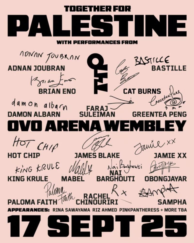 The lineup features Adnan Joubran, Brian Eno, Damon Albarn, Faraj Suleiman, Greentea Peng, Hot Chip, James Blake, Jamie xx, King Krule, Mabel, Nai Barghouti, Obongjayar, Paloma Faith, Rachel Chinouriri, Sampha, Bastille, and Cat Burns. Special appearances include Rina Sawayama, Riz Ahmed, PinkPantheress, and more to be announced. Some performers are expected to present unique collaborations, while others will debut material created especially for the fundraiser.
