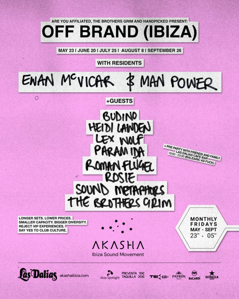 Man Power and Ewan McVicar are teaming up with Andy & Mark (aka The Brothers Grim) to present a new monthly residency in Ibiza under the banner OFF BRAND. Taking place at the 300-capacity Akasha club on the north of the island, the residency will run across select Fridays from May 23rd to September 26th, 2025.