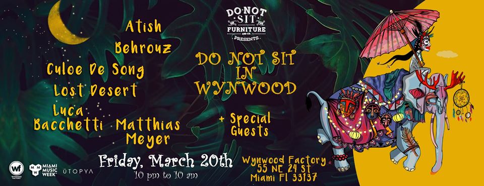 Do Not Sit On The Furniture & Utopya Miami collaborate to bring you a new adventure at Wynwood Factory. Spearheaded by Do Not Sit main man Behrouz, he’s joined with musical selectors Atish, Culoe De Song, Lost Desert, Luca Bacchetti, Mathias Meyer + special guests. Experience the DNS magic to ignite your MMW week in full blast!