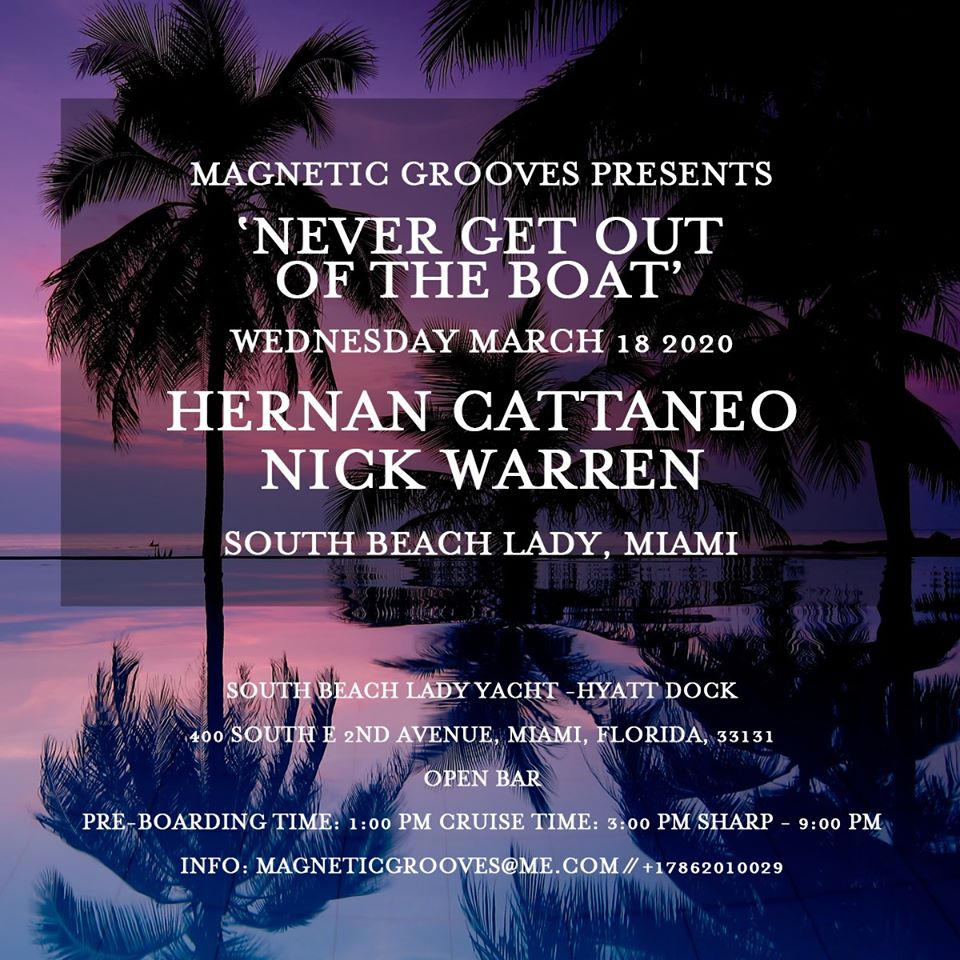 One of our favorite back-to-back’s returns for their epic sunset cruise. Join progressive house icons Hernan Cattaneo & Nick Warren at The South Beach Lady for an event not to be missed – For extremely limited tickets, please contact magneticgrooves@me.com