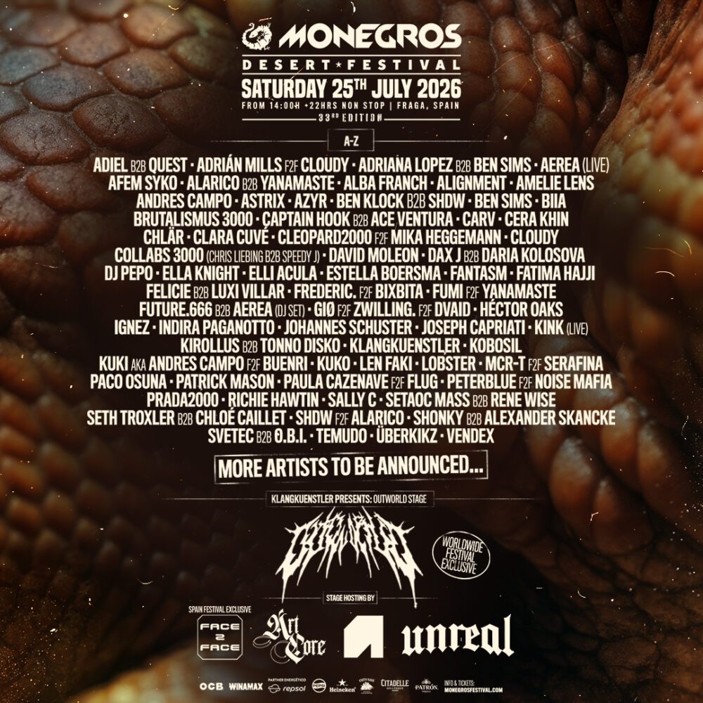 Alongside the artist announcements, the festival has outlined several stage concepts planned for 2026. Among them is OUTWORLD, a new 360º stage with a capacity of 20,000 people, which Monegros describes as an exclusive hosting worldwide. Additional formats include the return of 240 KM/H with its Face to Face concept, Unreal’s immersive staging, a renewed collaboration with Awakenings, and ARTCORE, the project led by Indira Paganotto.