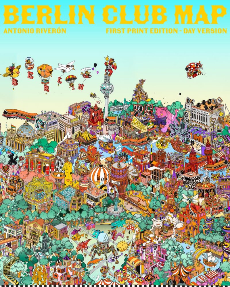 Artist and illustrator Antonio Riverón has unveiled the ‘Berlin Club Map, Day Version’, the first printed edition of his detailed illustrated map dedicated to Berlin’s club culture. The initial run will be limited and includes signed and stamped copies.