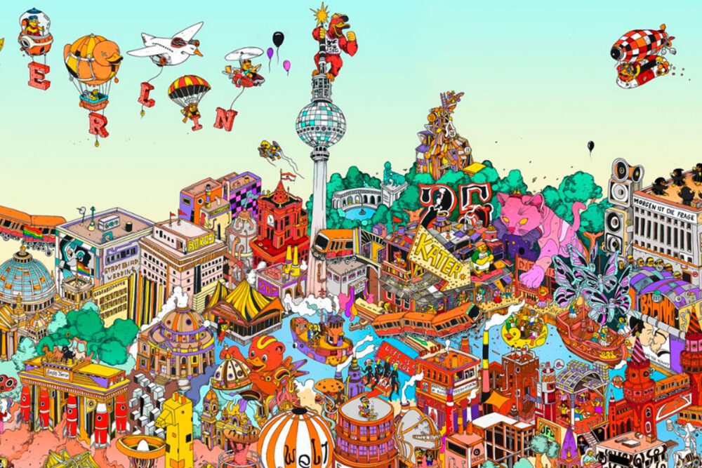 The large-format print captures references, characters, and moments from Berlin’s nightlife.