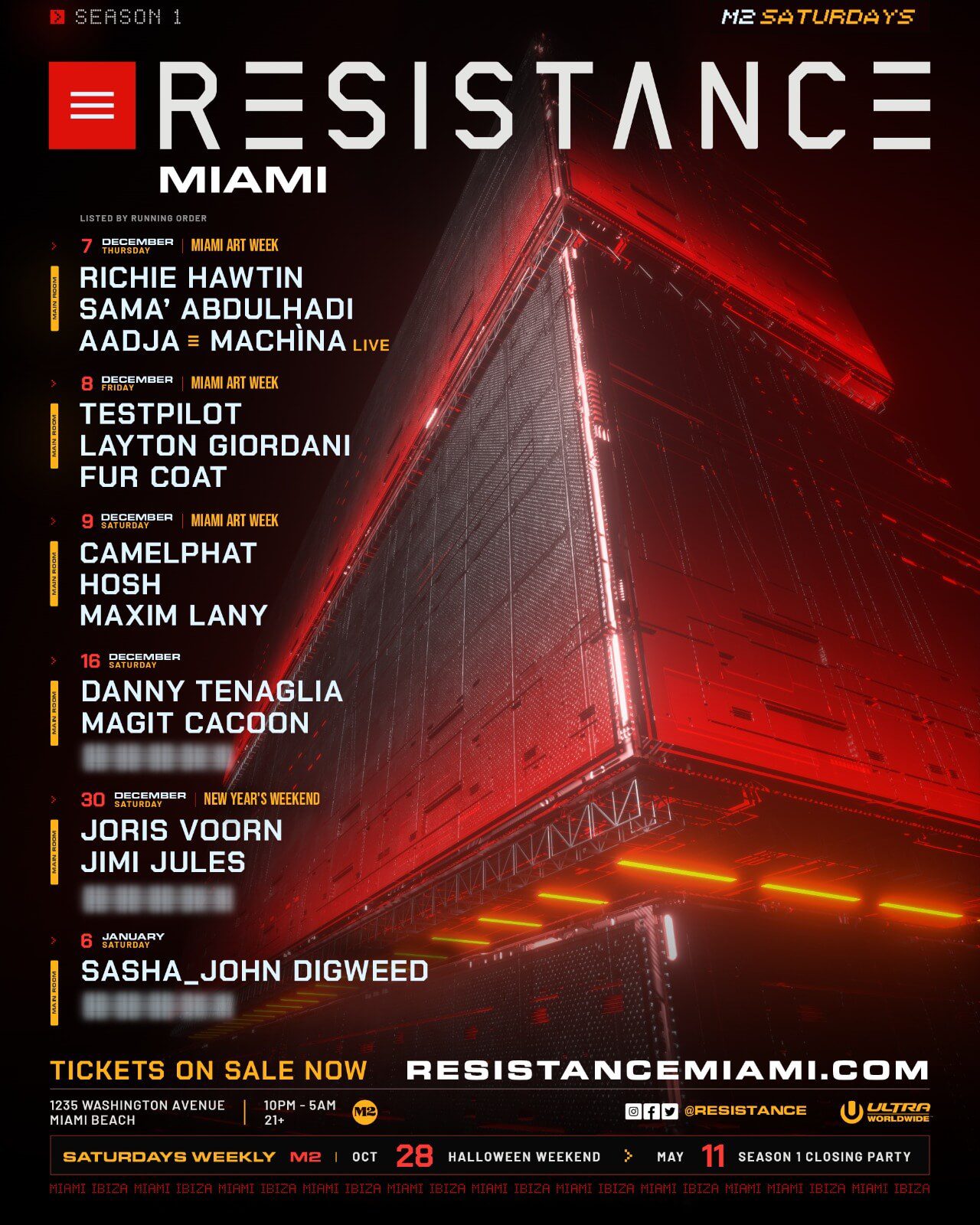 RESISTANCE Miami is holding its first season at M2 Club in Miami. This underground concept will present four weeks of programming during the Winter season, starting on December’s Art Week until early January of 2024.