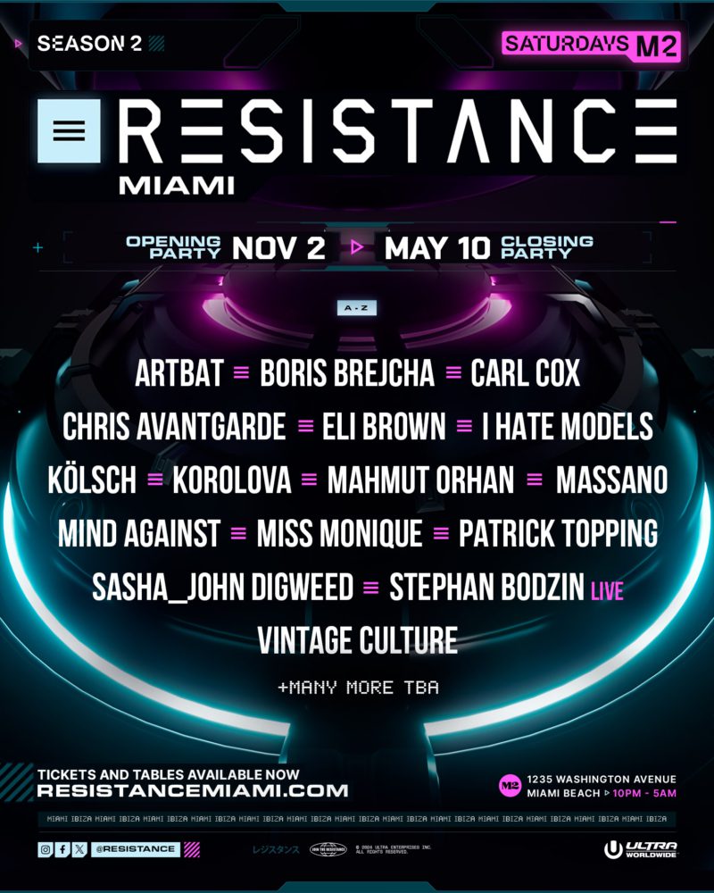 RESISTANCE, Ultra’s underground brand, returns to Miami for its second U.S. club residency season. The M2 venue will host the dates from November 2nd, 2024, to May 10th, 2025.