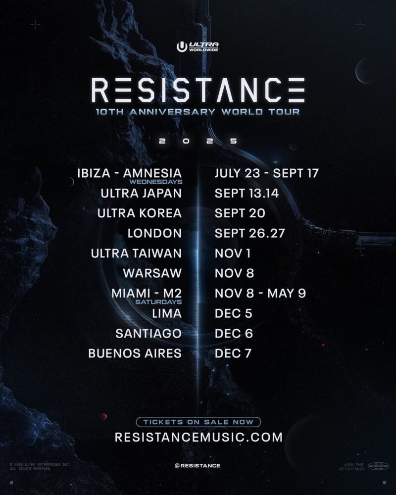 RESISTANCE, ULTRA Worldwide’s underground concept, has announced its 10th Anniversary World Tour, with events planned across Latin America, Europe, Asia, and the United States. The tour will span club residencies, multi-day events, and festival programming through 2025.