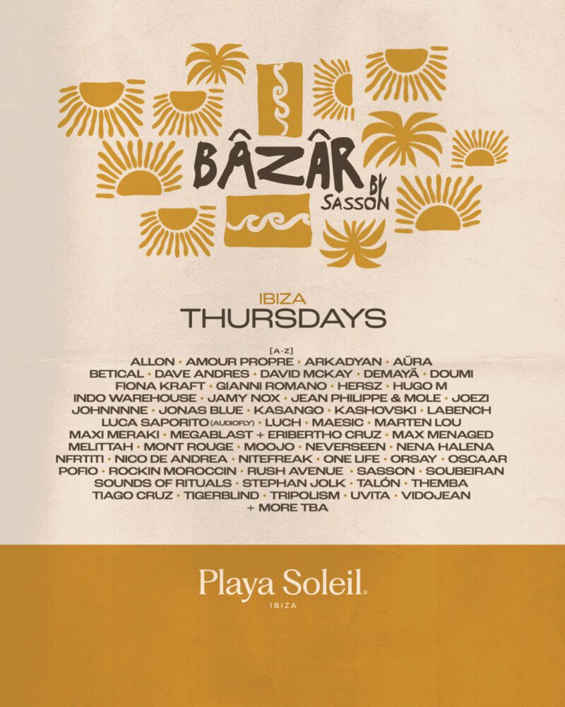 Sasson’s concept party Bâzâr is bringing its signature sound to Playa Soleil Ibiza with a full-season residency every Thursday from June 5th to October 2nd, 2025.