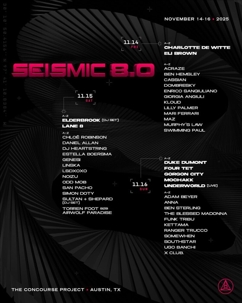 Seismic Dance Event has unveiled the lineup for its 8.0 edition, taking place from November 14th to 16th, 2025, at The Concourse Project in Austin, Texas. Known for its carefully curated lineup and intimate atmosphere, Seismic continues to expand its profile as one of North America’s leading boutique house and techno festivals.