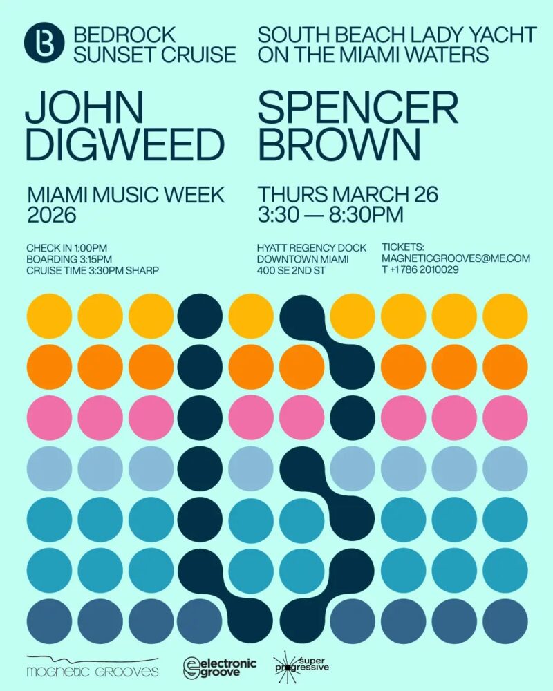 John Digweed will be showcasing the imprint’s sound, alongside Spencer Brown, who will be headlining the Bedrock Cruise on March 26th, 2026, during Miami Music Week. Organized by Magnetic Grooves and set aboard the South Beach Lady, the event will transform Biscayne Bay into a moving dance floor framed by the Miami skyline, offering a focused alternative to the week’s marathon club nights. Grab your tickets here.