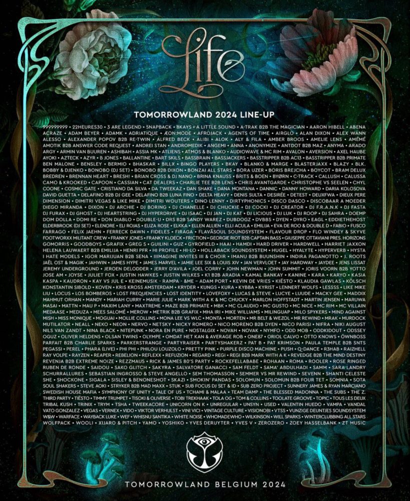 Among the many renowned acts scheduled to perform at Tomorrowland Belgium 2024 are ACRAZE, Adam Beyer, Adriatique, Afrojack, Agents Of Time, Alesso, Amelie Lens, Amémé, ANNA, Anyma, Argy, Armin van Buuren, A-Trak B2B The Magician, Bonobo, Bora Uzer, Boris Brejcha, Brina Knauss, Chris Avantgarde, Dan Shake, David Guetta, Denis Sulta, Dixon, DJ Heartstring, DVBBS, Elderbrook, Eliza Rose, Felix Jaehn, Fideles, Four Tet, Hardwell, HI-LO, Indira Paganotto, John Newman, Joris Voorn B2B Yotto, Keinemusik, Kevin de Vries, Kölsch, Konstantin Sibold, MANDY, Mathame, Mind Against, Miss Monique, Nicky Romero, Oliver Heldens, Pretty Pink, Purple Disco Machine, REZZMAU5, Sama’ Abdulhadi, Sam Feldt, Solomun, Steve Angello, Swedish House Mafia, Tale Of Us, Tchami B2B Malaa, The Blessed Madonna, Tiësto, TSHA, Vintage Culture, WhoMadeWho, W&W, and many more.