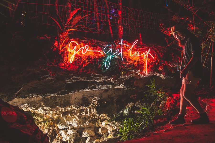 I excitedly sauntered along an illuminated path to the “Go Get Lost” cave that was entry into the sacred Cenote caves, which were revered by Mayans to be entry ways into the Xibalba underworld where they could communicate with the gods and ancestors that came before them. I took my sandals off to bath my feet in the murky waters hoping to feel what the ancient Mayan felt. I watched as others jumped in free of clothing to bask in the glistening and cooling cave waters. It was a refreshing rest to prepare me for the arduous dance journey that would soon be upon me.