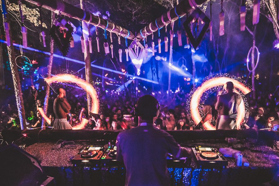 Walking along a 2 kilometers dirt road that led into the jungle, with only the light of a sky full of stars and an impregnated and ominous moon illuminating the way, I felt a nervous yet excited feeling begin to brim up inside of me. I could feel the humid mist from the tropical vegetation whisk against my skin, as a faint cool breeze raised goose bumps all over my body. I paid close attention to the stirrings of the creatures of the night, which began to fade out as alluring sounds of tribal drums mixed in with a dominating bass began to emerge from a distance. I started to feel a little bit like Alice in Wonderland ready and willing to go down the rabbit hole of time and space.
