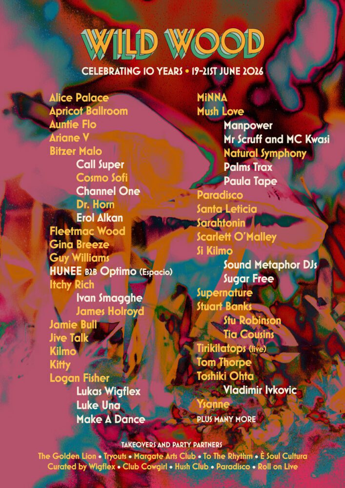 The Main Stage’s vortex wooden structure returns with an updated laser and light show, while the redesigned Lost Stage, Sundown Stage, and woodland club spaces shape the weekend’s flow. Takeovers and party partners include The Golden Lion, Tryouts, Margate Arts Club, To The Rhythm, È Soul Cultura, Curated by Wigflex, Club Cowgirl, Hush Club, Paradisco, and Roll on Live.